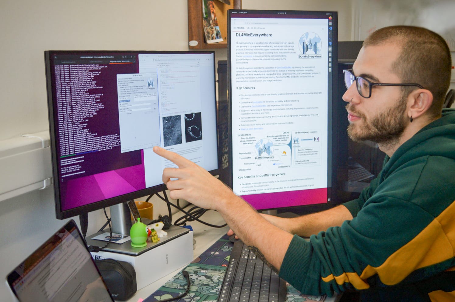 A aprendizagem profunda, um subcampo da IA, revolucionou a análise de conjuntos de dados de microscopia extensos e complexos, permitindo aos cientistas identificar, rastrear e analisar automaticamente células e estruturas subcelulares. No entanto, a falta de recursos computacionais e conhecimentos em IA tem dificultado a adoção destas técnicas na investigação em ciências da vida por parte de muitos cientistas no seu trabalho. A DL4MicEverywhere traz uma solução para estes desafios, criando uma interface intuitiva para os investigadores treinarem e usarem modelos de aprendizagem profunda em qualquer tipo de experiência de análise de imagem em diferentes infraestruturas computacionais, desde simples computadores a clusters de alto desempenho.